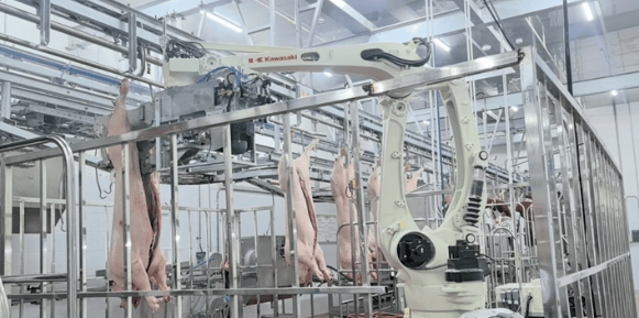 正在修文县悠久街道的现代化屠宰车间内,3条从动化出产线高速运转,机械人精准地将一头猪分化,工人们随后进行精细化朋分。公司总司理周天池引见,这条出产线头,效率是保守屠宰场的3倍,而人工成本仅为保守屠宰场的三分之一。