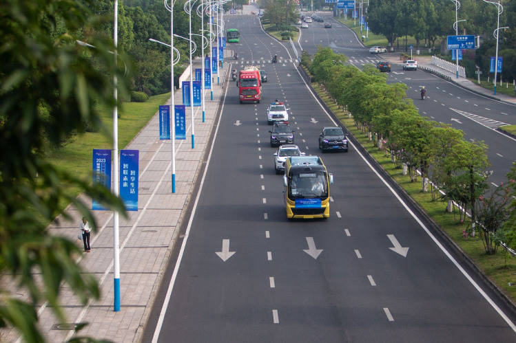 图为加入2023智博会智能汽车使用场景挑和赛L3级/L4级从动驾驶公交车组别赛事的车辆行驶正在沉庆城区道上。材料图片。