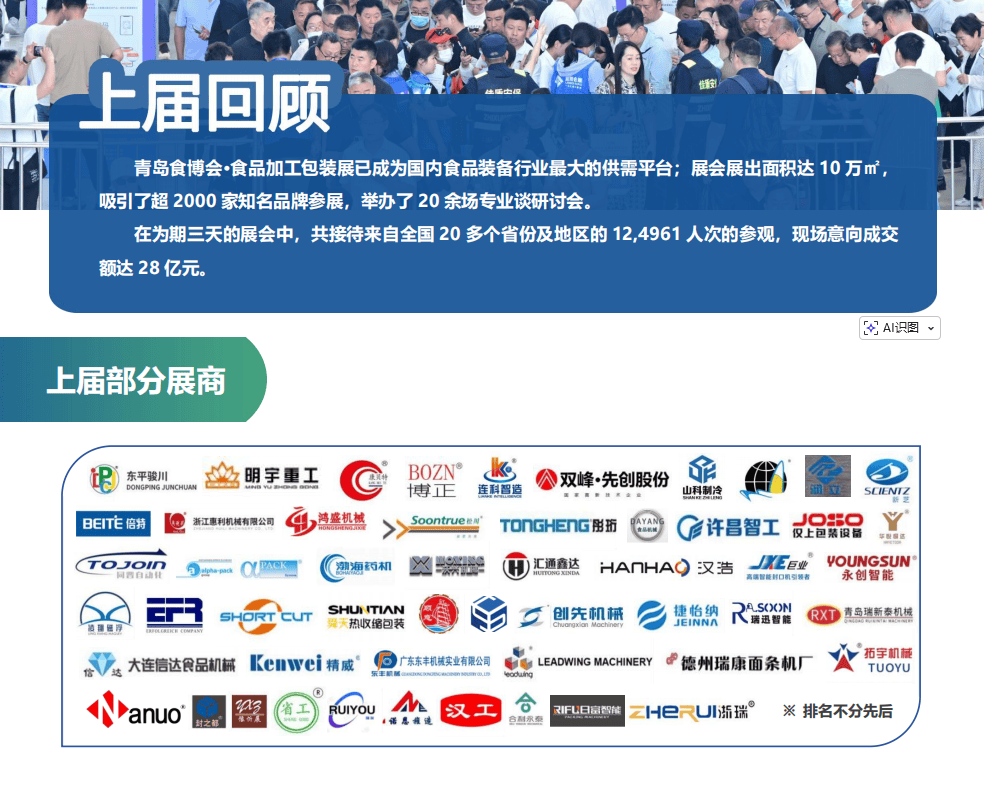 2026青岛食物机械展由食物工业协会结合从办,青岛蓝博国际会展无限公司承办,估计展出头具名积14万平方米,吸引2500+全球参展商,展出3000+项立异手艺及设备,涵盖食物加工、智能包拆、从动化出产线、冷链物流等全财产链处理方案。